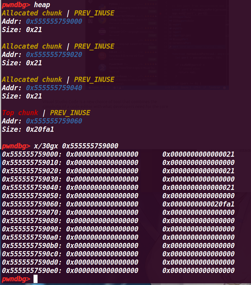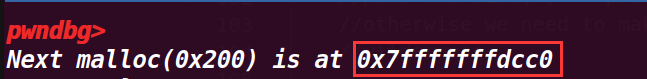 申请一个smallbin,由于现在bin中没有chunk,所以会从topchunk上切割出一个,然后输出其起始地址(从pre_size开始)这里打印的地址是0x555555759000