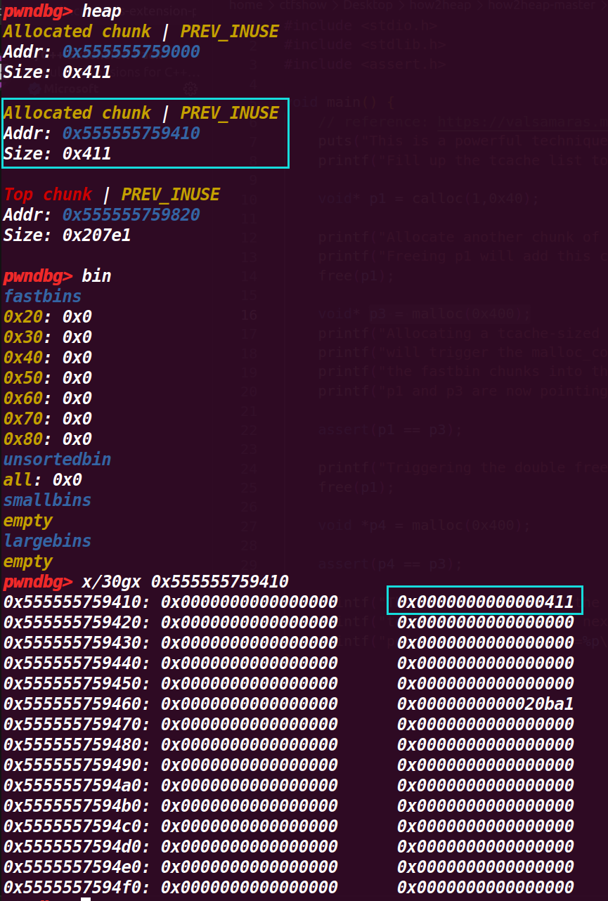 # 这里其实有个隐藏的问题:为什么不直接连续释放两次chunk a?