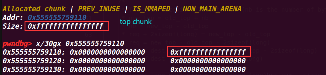 一开始我不明白为什么要减去一个sizeof(long),但是在调试上一步时,发现给的real_size将topchunk的pre_size位也算入了进去,所以才要减掉这一部分才刚好是topchunk的头部