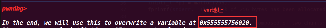fprintf(stderr, "\nIn the end, we will use this to overwrite a variable at %p.\n", bss_var);