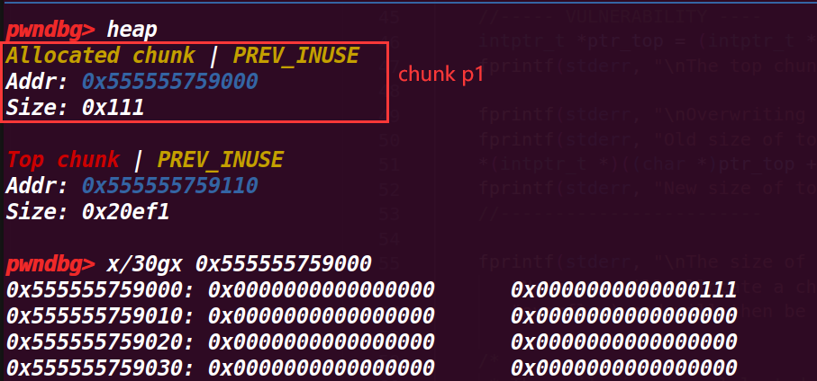 fprintf(stderr, "\nNow the heap is composed of two chunks: the one we allocated and the top chunk/wilderness.\n");