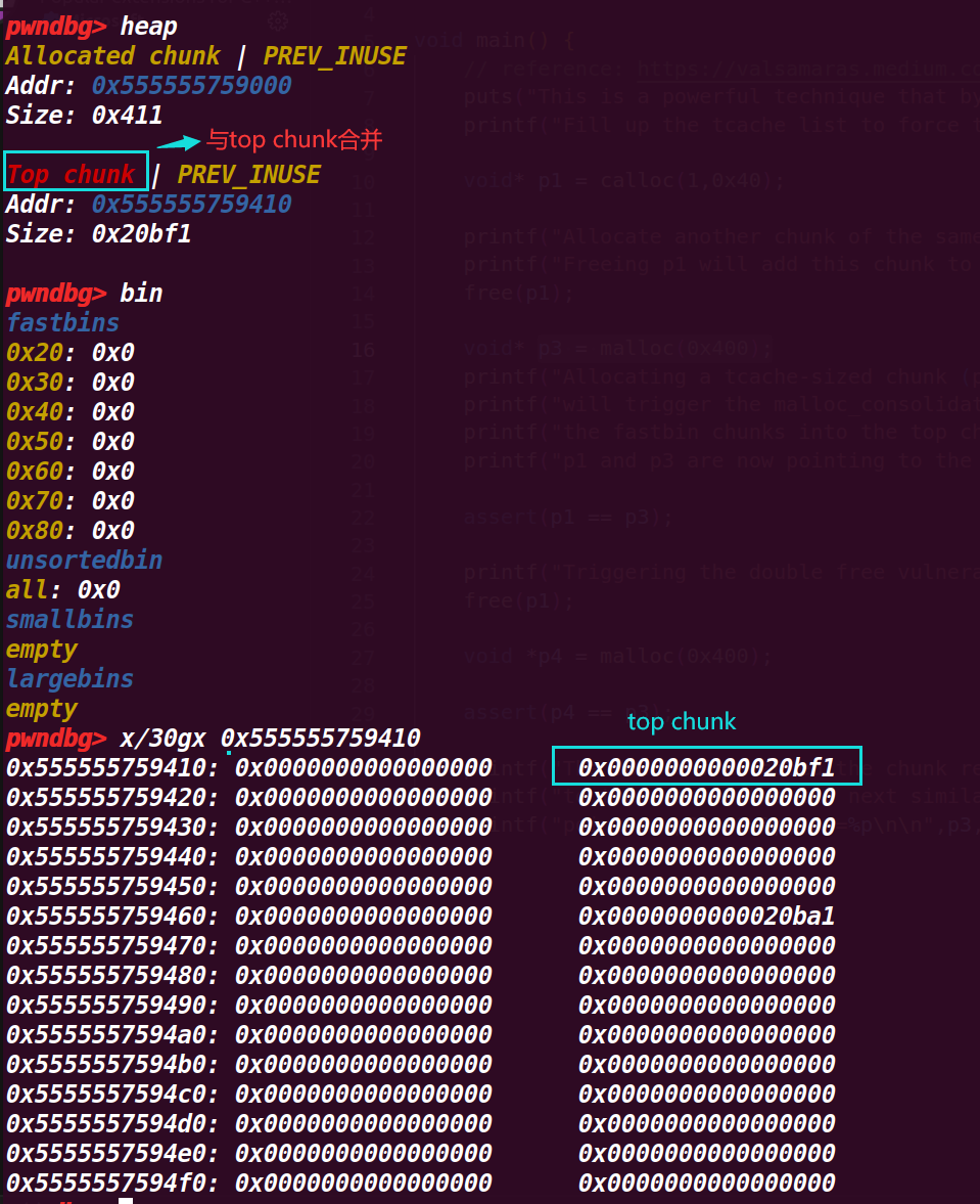 另外:malloc_consolidate既可以作为fastbin的初始化函数,也可以作为fastbin的合并函数。
