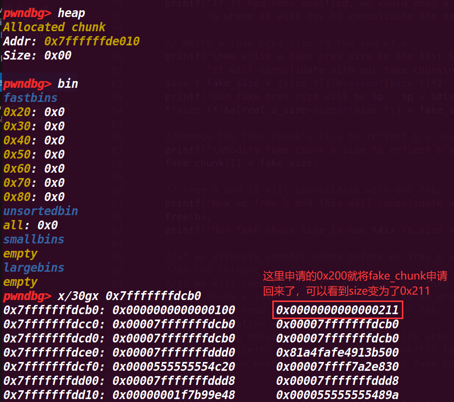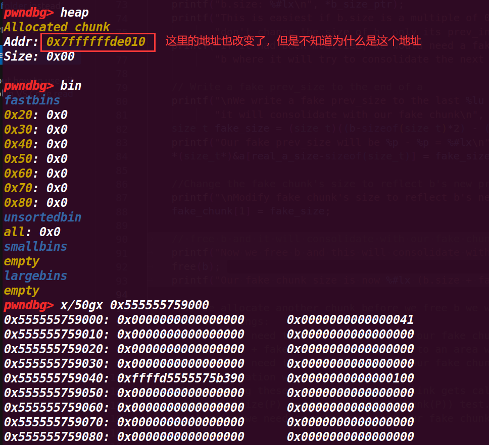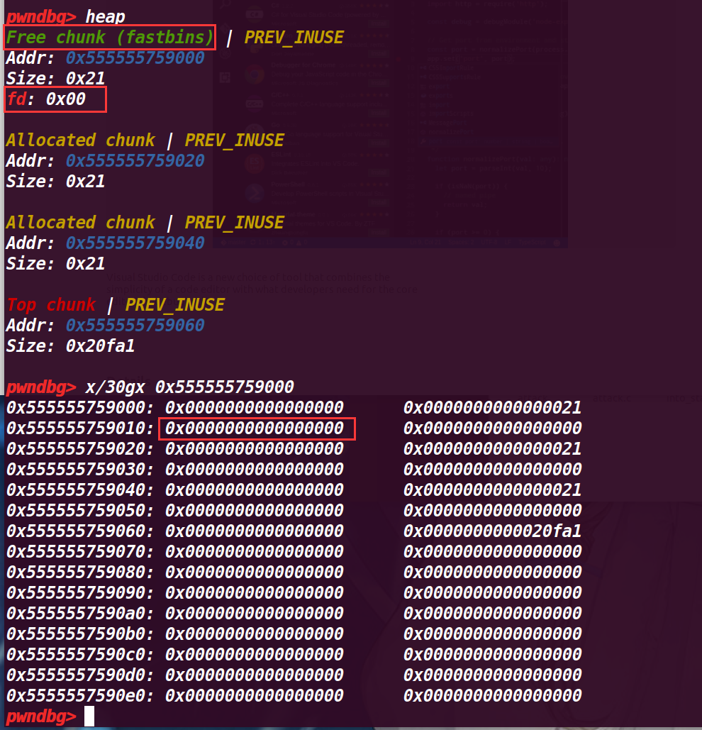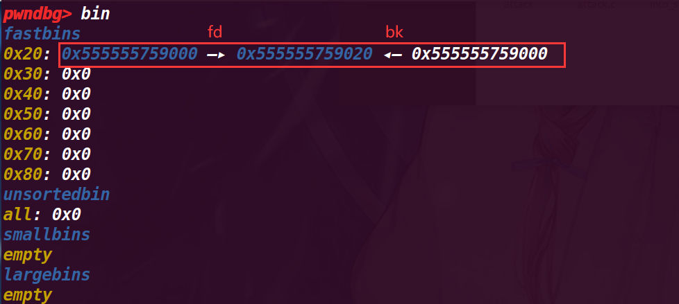 可以发现,释放的chunk b fd指向了前面释放的chunk a,这里是由于fastbin的后进先出的由于,fastbin->新释放的chunk->上一个释放的chunk